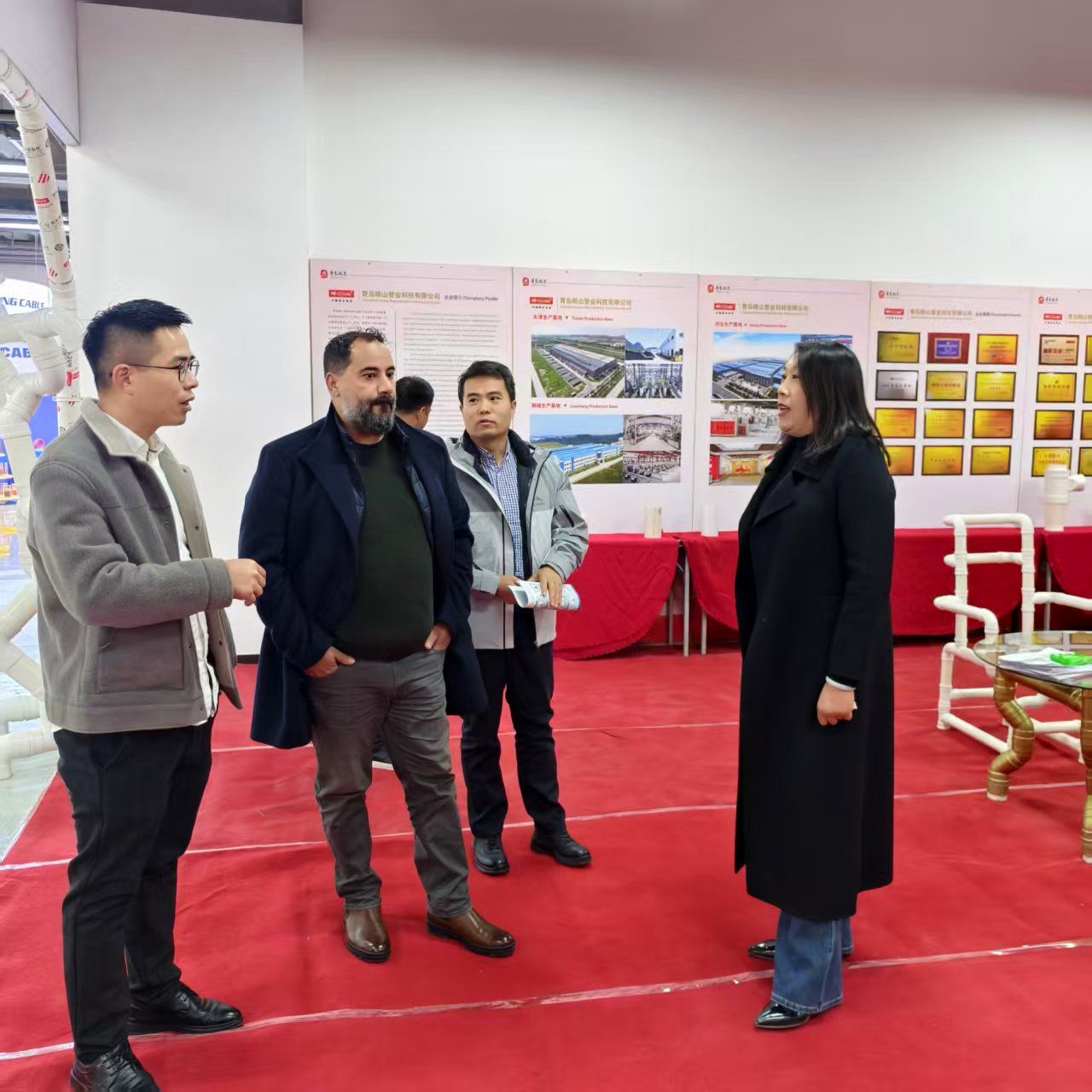 在展示區(qū)域,嶗山管業(yè)工作人員向來訪客商介紹了企業(yè)的生產(chǎn)布局、產(chǎn)品體系及技術優(yōu)勢,通過項目案例展板與實物展示,直觀呈現(xiàn)了管道產(chǎn)品在基建、民生領域的適配性?,F(xiàn)場陳列的管道制品及創(chuàng)意應用(如管道材質的展示家具),也讓客商對產(chǎn)品的實用性與拓展?jié)摿τ辛烁唧w的認知。
